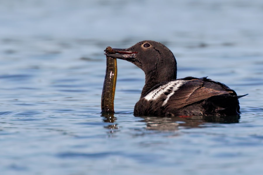 Pigeon Guillemots are the only black and white seabird with bright red feet that breed on land in South Puget Sound. Most are more comfortable in and under the water than in the air. Underwater, they use their wings as flippers to swim up to 150 feet deep chasing after sculpins and gunnels, which are the most common food items. These burrow nesting birds return to the same bluffs each year and typically lay only two eggs each. Both the male and female incubate the eggs for about four weeks and care for the young until they are ready to leave the nest after 4-6 weeks.
